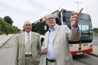 Prezentacja i specjalny przejazd 8 nowych przegubowych autobusów Mercedes ConectoG, które zakupił Zakaład Komunikacji Miejskiej w Gdańsku. Nz. Prezydent Gdańska Paweł Adamoiwcz i Prezes ZKM Gdańsk Jerzy Zgliczyński (po lewej)