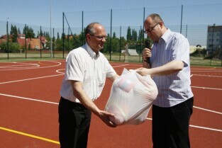 Otwarcie wielofunkcyjnego boiska Gdańskiego Ośrodka Kultury Fizycznej. Gdańsk Suchanino, ul. Paganiniego. Nz. Prezydent Gdańska Paweł Adamowicz i Dyrektor GOKF Jacek Sawicki