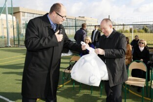 Otwarcie boiska w ramach programu "Junior Gdańsk 2012". Gdańsk Chełm, Zespół Szkół Ogólnokształcących nr 7 przy ul. Chałubińskiego. Nz. Prezydent Gdańska Paweł Adamowicz i Dyrektor ZSO 7 Marcin Hintz