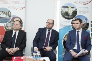 Gdańsk Ujeścisko, ul. Człuchowska. Oddanie do użytku budynku mieszkalnego zrealizowanego przez Gdańskie Towarzystwo Budownictwa Społecznego. Konferencja prasowa poświęcona polityce mieszkaniowej władz Gdańska. Nz. od lewej: Wojciech Deszczyński (Bank Gospodarstwa Krajowego), Prezydent Gdańska Paweł Adamowicz, Z-ca Prezydenta Gdańska Piotr Grzelak