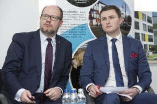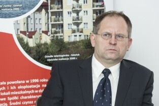 Gdańsk Ujeścisko, ul. Człuchowska. Oddanie do użytku budynku mieszkalnego zrealizowanego przez Gdańskie Towarzystwo Budownictwa Społecznego. Konferencja prasowa poświęcona polityce mieszkaniowej władz Gdańska. Nz. Wojciech Deszczyński (Bank Gospodarstwa Krajowego)