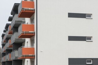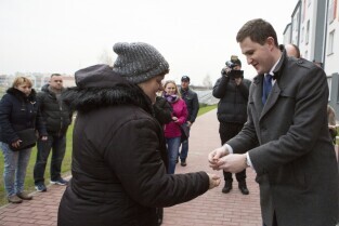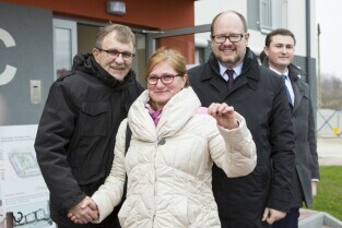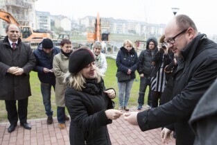 Gdańsk Ujeścisko, ul. Człuchowska. Oddanie do użytku budynku mieszkalnego zrealizowanego przez Gdańskie Towarzystwo Budownictwa Społecznego. Konferencja prasowa poświęcona polityce mieszkaniowej władz Gdańska.