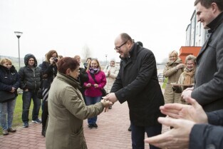 Gdańsk Ujeścisko, ul. Człuchowska. Oddanie do użytku budynku mieszkalnego zrealizowanego przez Gdańskie Towarzystwo Budownictwa Społecznego. Nz. Prezydent Gdańska Paweł Adamowicz