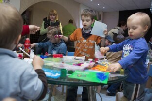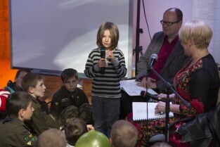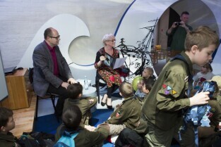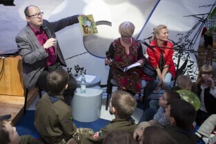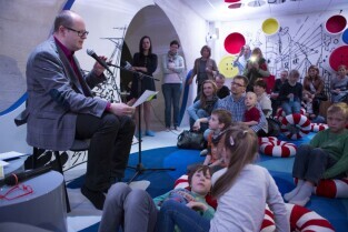 Wielkie Otwarcie pięciu nowych interaktywnych wystaw w Centrum Hewelianum. Nz. Prezydent Gdańska Paweł Adamowicz czyta dzieciom wiersze Jana Brzechwy