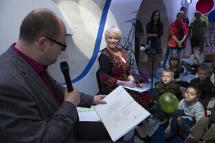 Wielkie Otwarcie pięciu nowych interaktywnych wystaw w Centrum Hewelianum. Nz. aktorka Katarzyna Figura i Prezydent Gdańska Paweł Adamowicz czytają dzieciom wiersze Jana Brzechwy