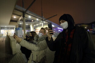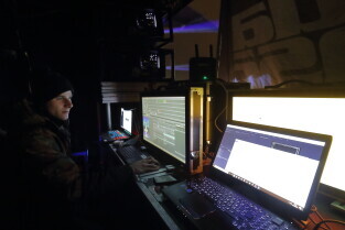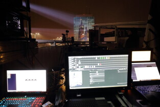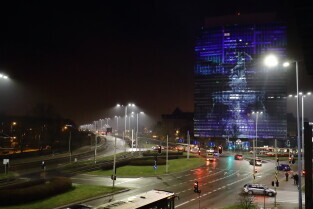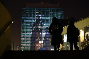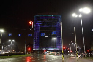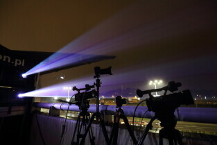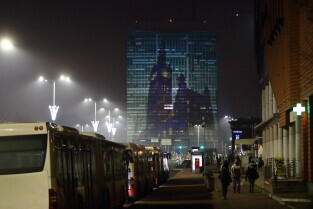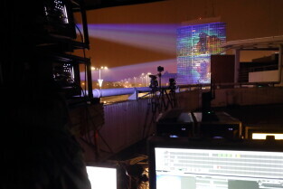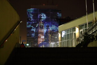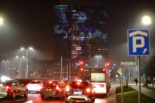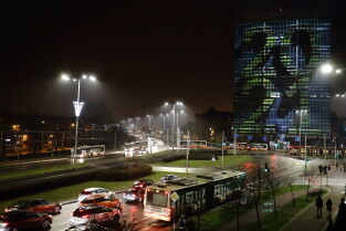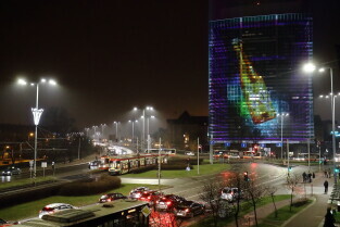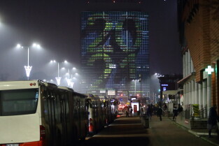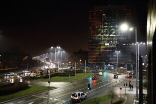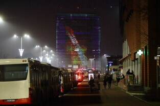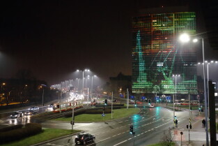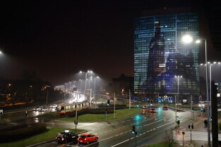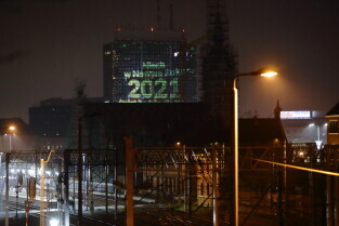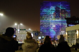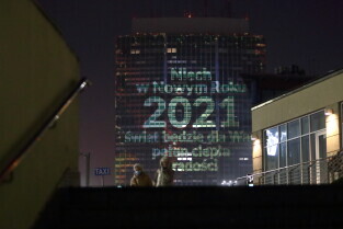 Gdańsk. Noworoczna widokówka dla gdańszczan. Na „Zieleniaku” wyświetlany jest pokaz multimedialny z wykorzystaniem techniki mappingu 3D.
