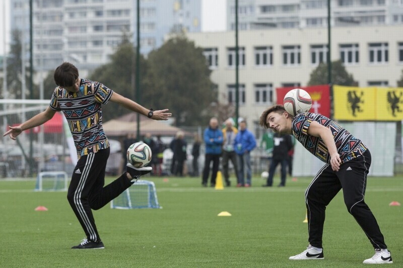 Gdańsk Zaspa. Otwarcie nowego stadionu przy ul. J. Meissnera oraz inauguracja turnieju "Piłkarska jesień. Do przerwy 0:1". Pokaz w wykonaniu duetu Fresh. Nz. po lewej Michał Rycaj, po prawej Łukasz Chwieduk