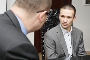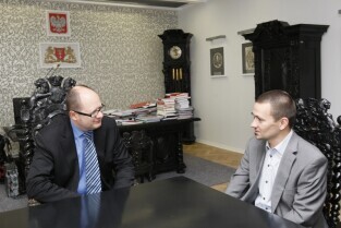 Spotkanie Prezydenta Gdańska Pawła Adamowicza z nowy trenerem Lechii Gdańsk Rafałem Ulatowskim. Gdańsk, Urząd Miejski