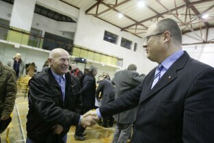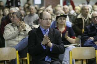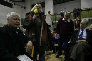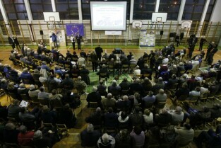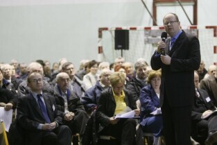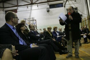 Spotkanie informacyjne poświęcone rozbudowie środkowego odcinka Trasy Słowackiego. Gdańsk, Szkoła Podstawowa 27. Nz. Prezydent Gdańska Paweł Adamowicz