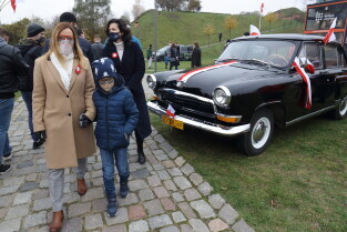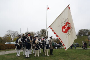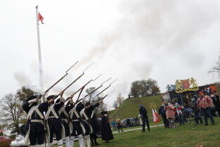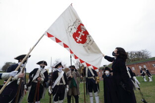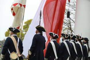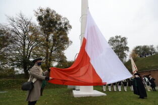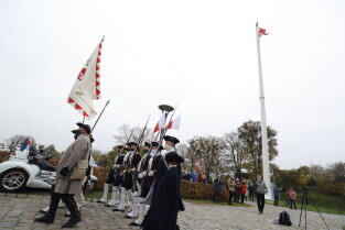 Gdańsk. Obchody 102. rocznicy odzyskania niepodległości. Wciągnięcie flagi państwowej na znajdujący się najwyższy w mieście maszt na Górze Gradowej.