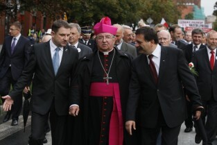 Oficjalne obchody 31. rocznicy podpisania Porozumień Sierpniowych w Gdańsku. Przemarsz pod Pomnik Poległych Stoczniowców. Nz. od lewej: Przewodniczący NSZZ Solidarność Piotr Duda, Metropolita Gdański Abp Sławoj Leszek Głódź, były Przewodniczący NSZZ Solidarność Janusz Śniadek