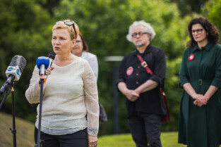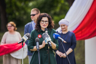 Gdańsk, Góra Gradowa. Obchody 4 czerwca. Uroczyste zawieszenie patchworkowej flagi. Nz. prezydent Gdańska Aleksandra Dulkiewicz