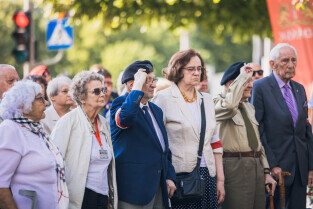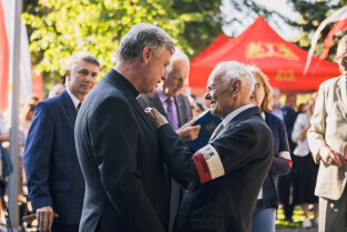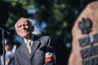 Gdańsk. Obchody 78. rocznicy wybuchu Powstania Warszawskiego. Uroczystość na Targu Rakowym, przy obelisku upamiętniającym Polskie Państwo Podziemne. Nz. Profesor Jerzy Grzywacz, prezes Okręgu Pomorskiego Światowego Związku Żołnierzy Armii Krajowej