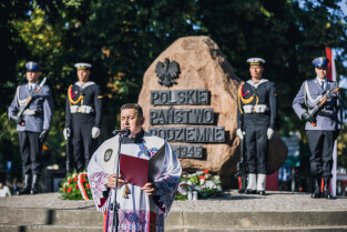 Gdańsk. Obchody 78. rocznicy wybuchu Powstania Warszawskiego. Uroczystość na Targu Rakowym, przy obelisku upamiętniającym Polskie Państwo Podziemne. Nz. Prezydent Gdańska Aleksandra Dulkiewicz