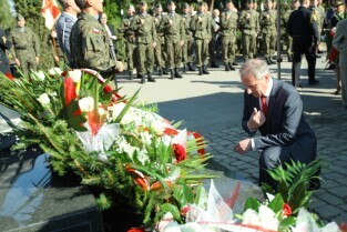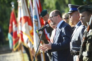 Gdańsk, Cmentarz Łostowicki, pomnik Golgoty Wschodu. Uroczyste Obchody Światowego Dnia Sybiraka i 77 rocznicy agresji sowieckiej na Polskę. Nz Prezydent Gdańska Paweł Adamowicz.