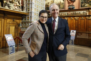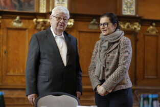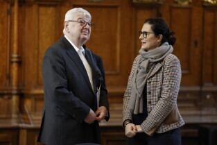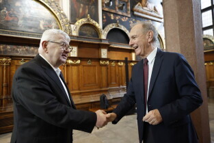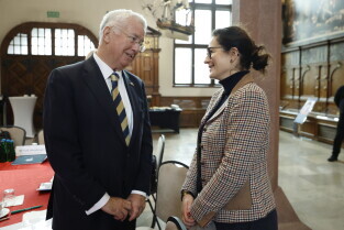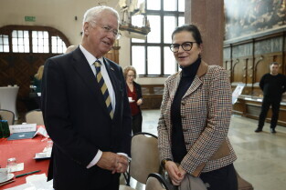 Gdańsk. Obrady Cambridge Round Table. Nz. Joschka Fischer, wicekanclerz i były minister spraw zagranicznych Niemiec i Bogdan Klich, były minister obrony narodowej RP.