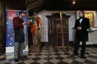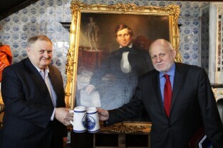 Gdańsk, Dwór Artusa. Prezentacja obrazu z poł. XIX w. "Portret kupca gdańskiego" autorstwa Louisa Sy, zakupionego dla Muzeum Historycznego Miasta Gdańska przez browar Amber. Nz. Dyrektor MHMG Adam Koperkiewicz (po prawej) i Prezes Browaru Amber Andrzej Przybyło (po lewej)