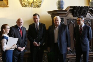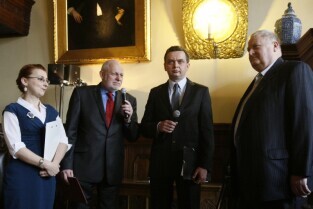 Gdańsk, Dwór Artusa. Prezentacja obrazu z poł. XIX w. "Portret kupca gdańskiego" autorstwa Louisa Sy, zakupionego dla Muzeum Historycznego Miasta Gdańska przez browar Amber. Nz. Dyrektor MHMG Adam Koperkiewicz (drugi od lewej), Prezes Browaru Amber Andrzej Przybyło (drugi od prawej) i Radny Miasta Gdańska Maciej Krupa (po prawej)