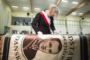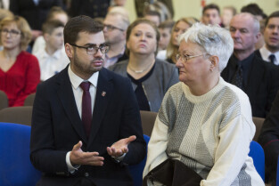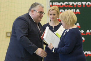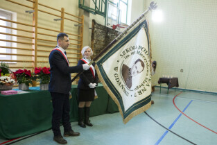 Uroczystość nadania imienia majora Mieczysława Słabego Szkole Podstawowej nr 7 w Gdańsku Złotej Karczmie przy ul. Mjr. Słabego 6. Nz. radny miasta Gdańska Mariusz Andrzejczak i bratanica patrona szkoły Maria Sławska Bonarska