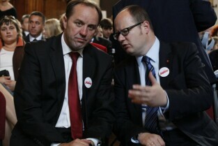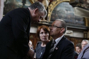Podsumowanie Roku Historii Najnowszej w edukacji oraz wręczenie nagród w konkursie "Ocal okruchy historii - młodzież buduje muzea". Gdańsk, Dwór Artusa. Nz. Marszałek Woj. Pomorskiego Mieczysław Struk (po lewej) i Prezydent Gdańska Paweł Adamowicz