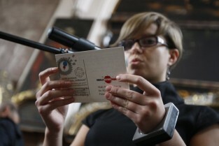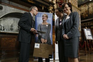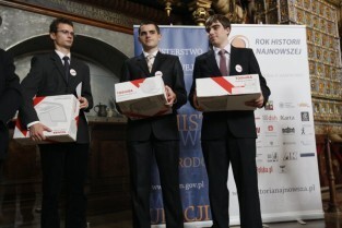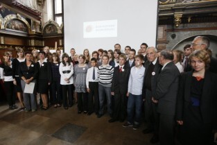 Podsumowanie Roku Historii Najnowszej w edukacji oraz wręczenie nagród w konkursie "Ocal okruchy historii - młodzież buduje muzea". Gdańsk, Dwór Artusa. Nz. roztrzygnięcie konkursu "300 00 pocztówek na 30-lecie Solidarności"