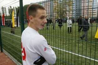 Oddanie do użytku kolejnego boiska wybudowanego w ramach programu "Orlik". Gdańsk, Zespół Szkół Ogólnokształcących nr 5 w Nowym Porcie. Nz. Prezydent Gdańska Paweł Adamowicz