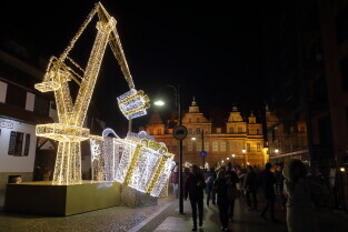 Gdańsk. Odpalamy święta - iluminacje na ulicach Gdańska. Nz. Dźwig stoczniowy na ul. Stągiewnej.
