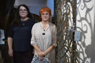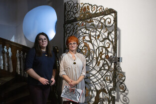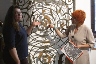 Gdańsk, Ratusz Głównego Miasta, oddział Muzuem Gdańska. Prezentacja XVII-wiecznej kraty, która dzięki laserowej renowacji odzyskała oryginalne polichromie z 1683 r. nz. od lewej: dr Anna Kriegseisen (Pracownia Konserwacji Zabytków) i dr Katarzyna Darecka (Muzeum Gdańska)