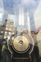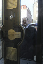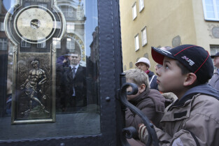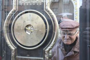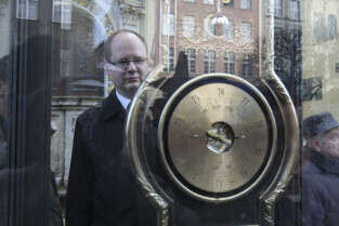 Odsłonięcie Kolumny Meteorologicznej Daniela Gabriela Fahrenheita. Gdańsk, Długi Targ. Nz. kolumnę ogląda Paweł Adamowicz, Prezydent Gdańska
