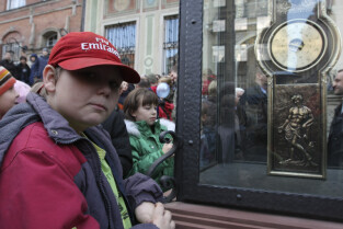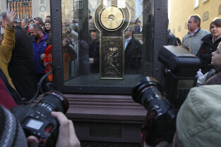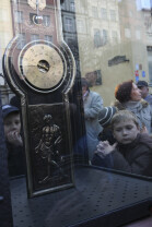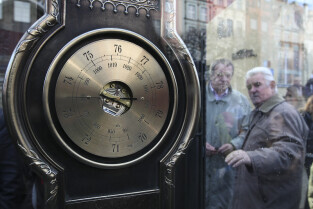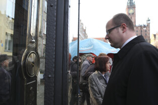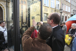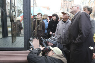Odsłonięcie Kolumny Meteorologicznej Daniela Gabriela Fahrenheita. Gdańsk, Długi Targ. Wydarzenie wzbudzało duże zainteresowanie mieszkańców i fotoreporterów. Nz. z aparatami Łukasz Głowala (w białej czapce) i Adam Warżawa