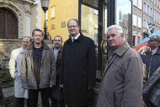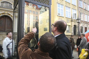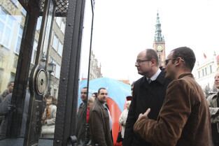 Odsłonięcie Kolumny Meteorologicznej Daniela Gabriela Fahrenheita. Gdańsk, Długi Targ. Nz. kolumnę oglądają: Paweł Adamowicz Prezydent Gdańska oraz Dawid Kubacki, pracownik Politechniki Gdańskiej, który wyskalował urządzenia meteorologiczne