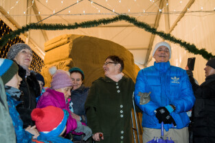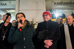 Gdańsk, ul. Opata Jacka Rybińskiego. Odsłonięcie Szopki z Piasku i spotkanie ekumeniczne z duchownymi różnych wyznań - Bądźmy wspólnotą! Nz. Posłanka Małgorzata Chmiel