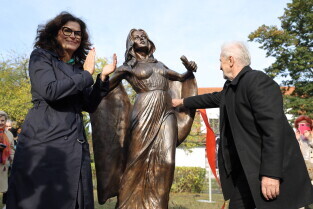 Gdańsk.Odsłonięcie pomnika Ireny Jarockiej. Nz. Aleksandra Dulkiewicz, prezydent Gdańska i Michał Sobolewski, mąż artystki.