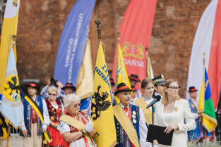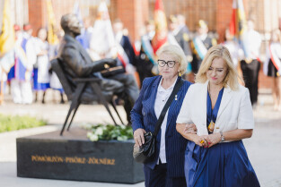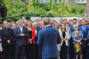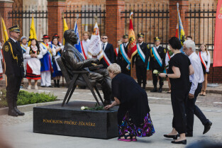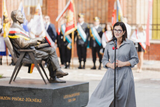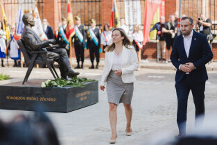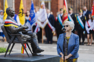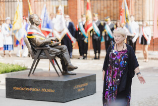 Gdańsk, skwer u zbiegu ulic Świętojańskiej i Minogi. Odsłonięcie pomnika Lecha Bądkowskiego. Nz. Prezydent Gdańska Aleksandra Dulkiewicz