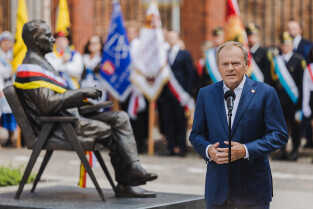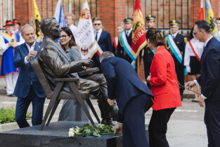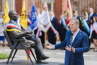 Gdańsk, skwer u zbiegu ulic Świętojańskiej i Minogi. Odsłonięcie pomnika Lecha Bądkowskiego. Nz. Donald Tusk premier RP