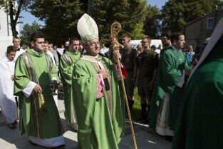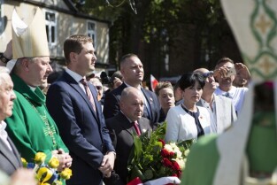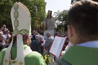 Gdańsk Orunia, ul. Gościnna. Odsłonięcie pomnika Danuty Siedzikówny ps. Inka, sanitariuszki Armii Krajowej zamordowanej przez komunistów w gdańskim areszcie w 1946 r. Nz. Metropolita Gdański Abp Sławoj Leszek Głódź