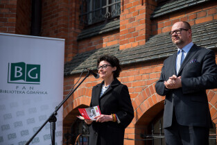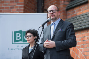 Gdańsk, ul. Wałowa. Odsłonięcie pomnika dyr. Mariana Pelczara. Nz. Dyrektor Anna Walczak, Prezydent Gdańska Paweł Adamowicz