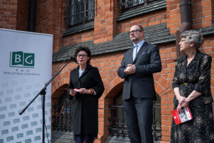 Gdańsk, ul. Wałowa. Odsłonięcie pomnika dyr. Mariana Pelczara. Nz. Dyrektor Anna Walczak, Prezydent Gdańska Paweł Adamowicz i Dr. Maria Pelczar