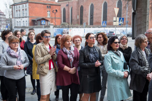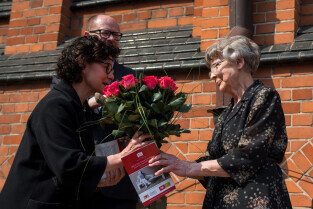 Gdańsk, ul. Wałowa. Odsłonięcie pomnika dyr. Mariana Pelczara. Nz. Dr. Maria Pelczar