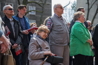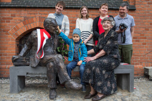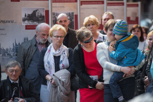 Gdańsk, ul. Wałowa. Odsłonięcie pomnika dyr. Mariana Pelczara. Nz. Dr. Maria Pelczar z rodziną