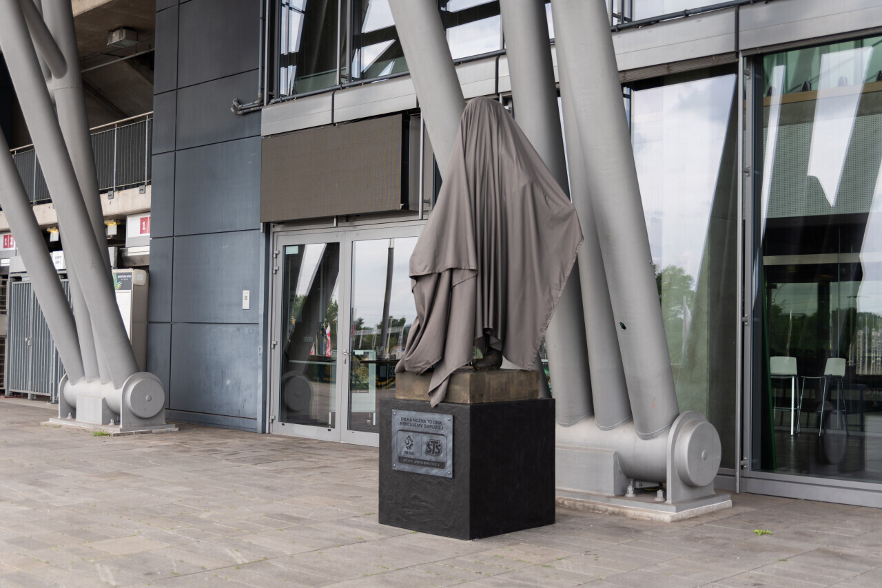 Gdańsk, Polsat Plus Arena Gdańsk. Odsłonięcie pomnika piłki nożnej kobiet. W wydarzeniu wzięły udział reprezentantki Polski w piłce nożnej Ewelina Kamczyk i Sylwia Matysik