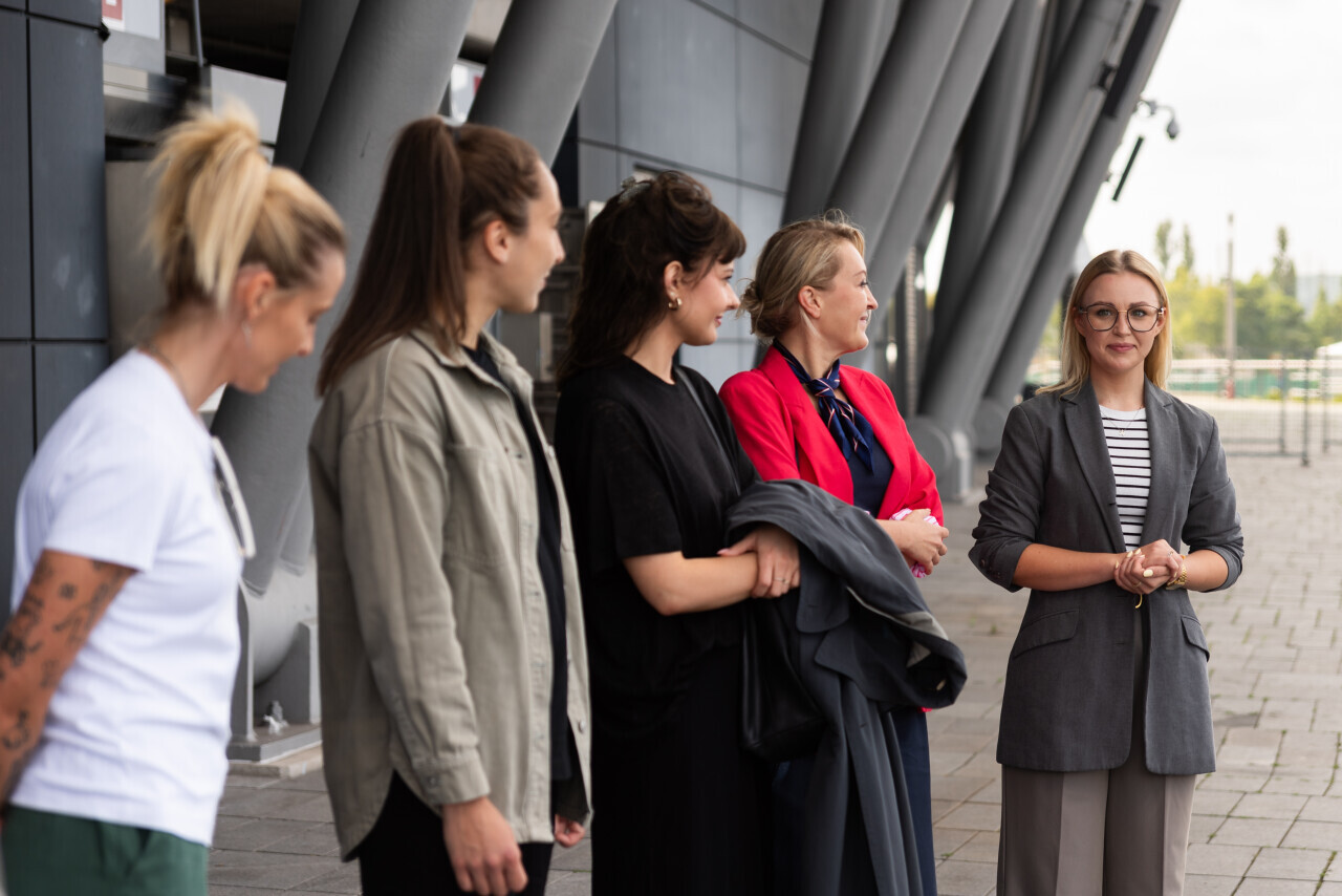 Gdańsk, Polsat Plus Arena Gdańsk. Odsłonięcie pomnika piłki nożnej kobiet. W wydarzeniu wzięły udział reprezentantki Polski w piłce nożnej Ewelina Kamczyk i Sylwia Matysik