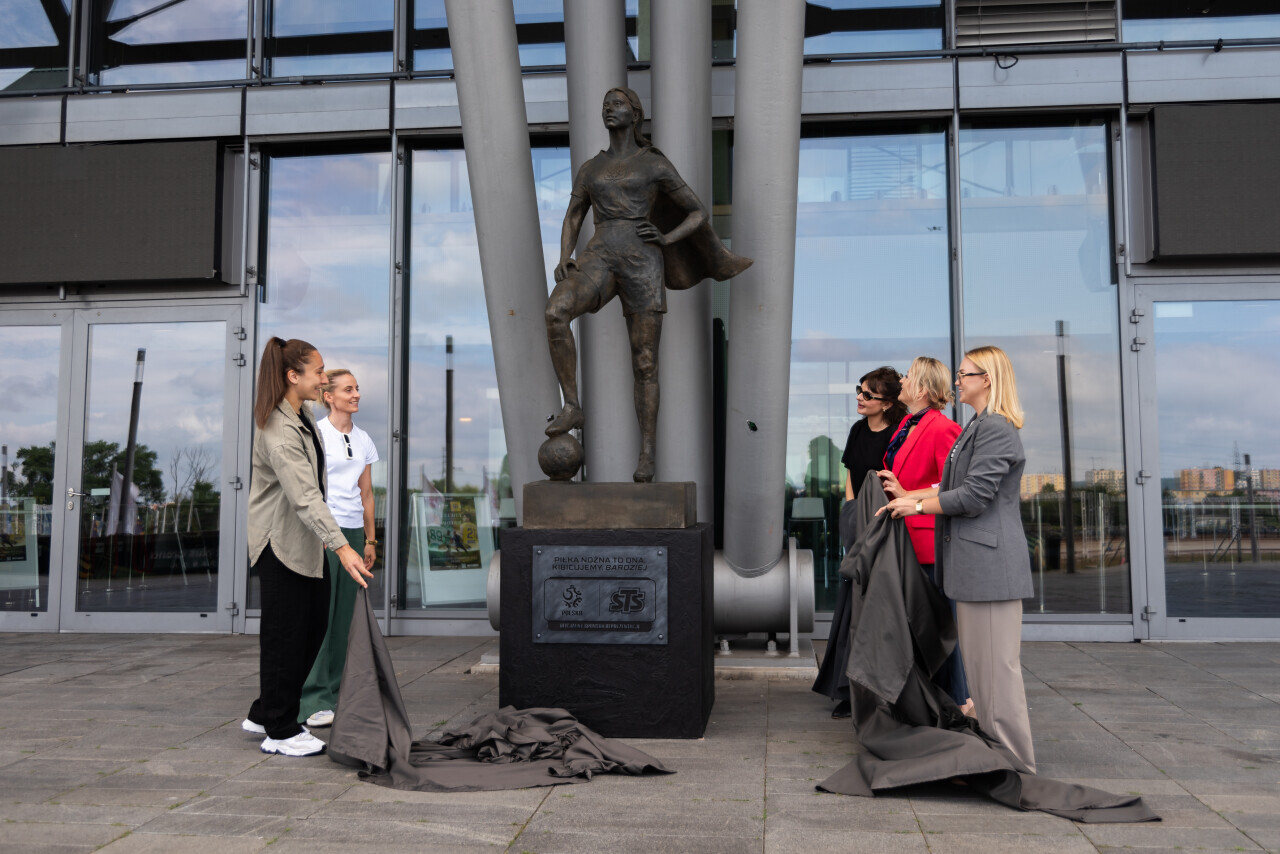 Gdańsk, Polsat Plus Arena Gdańsk. Odsłonięcie pomnika piłki nożnej kobiet. W wydarzeniu wzięły udział reprezentantki Polski w piłce nożnej Ewelina Kamczyk i Sylwia Matysik