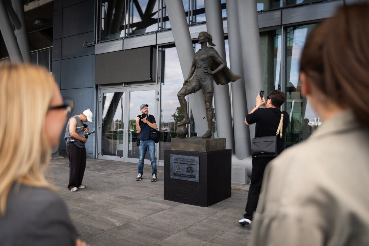 Gdańsk, Polsat Plus Arena Gdańsk. Odsłonięcie pomnika piłki nożnej kobiet. W wydarzeniu wzięły udział reprezentantki Polski w piłce nożnej Ewelina Kamczyk i Sylwia Matysik