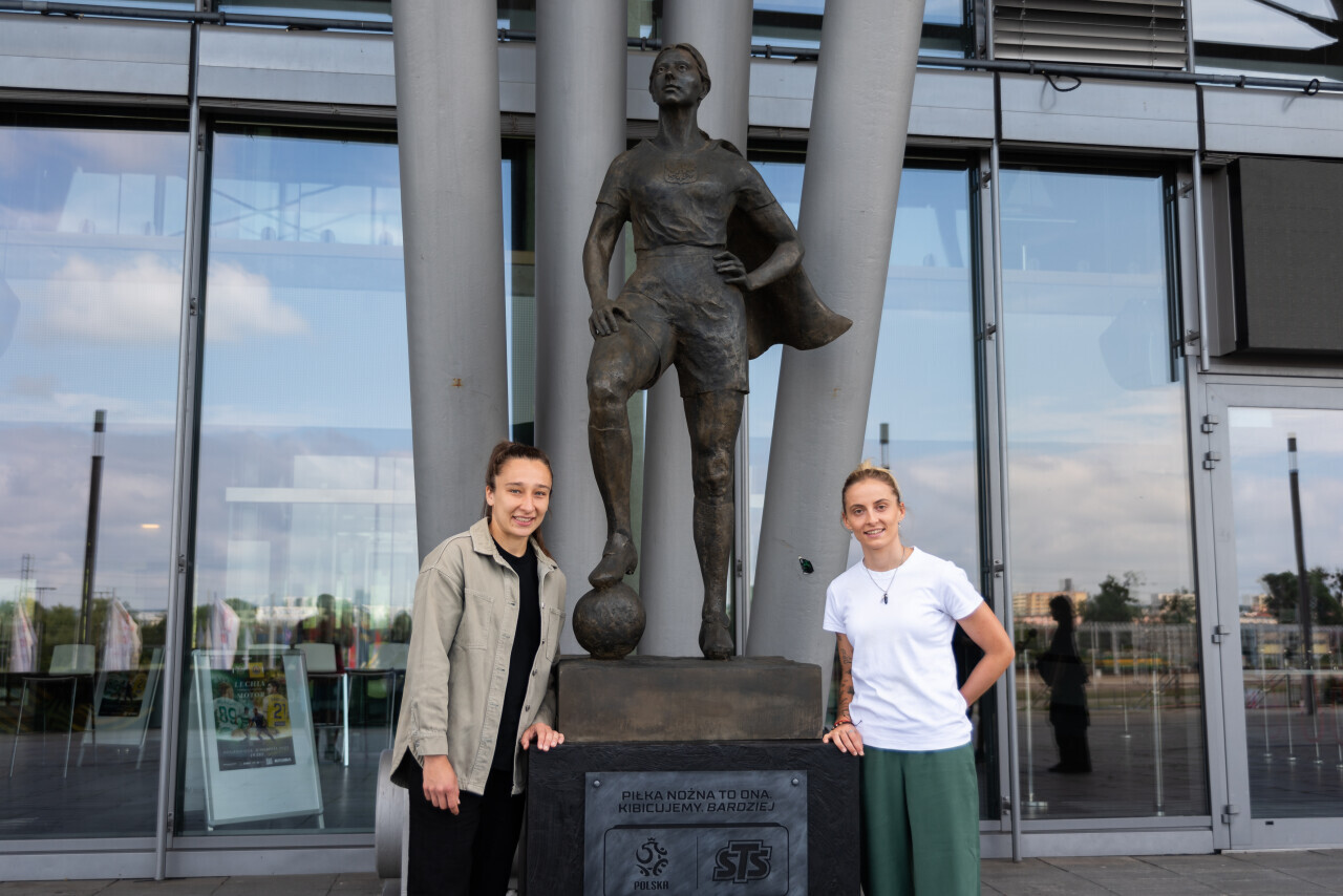 Gdańsk, Polsat Plus Arena Gdańsk. Odsłonięcie pomnika piłki nożnej kobiet. W wydarzeniu wzięły udział reprezentantki Polski w piłce nożnej Ewelina Kamczyk i Sylwia Matysik