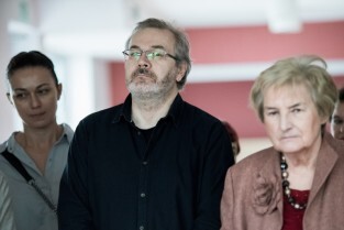 Gdańsk. Odsłonięcie portretu Barbary Piaseckiej Johnson fundatorki siedziby Fundacji - Instytutu Wspomagania Rozwoju Dziecka (IWRD) w Gdańsku. Nz w środku, Jacek Kornacki - polski malarz, rysownik, pedagog Akademii Sztuk Pięknych w Gdańsku, autor portretu
