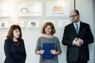 Gdańsk. Odsłonięcie portretu Barbary Piaseckiej Johnson fundatorki siedziby Fundacji - Instytutu Wspomagania Rozwoju Dziecka (IWRD) w Gdańsku. Nz dr Anna Budzińska, dyrektor fundacji, Iwona Ruta-Sominka i Prezydent Gdańska, Paweł Adamowicz