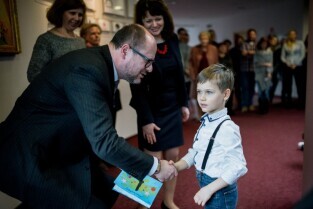 Gdańsk. Odsłonięcie portretu Barbary Piaseckiej Johnson fundatorki siedziby Fundacji - Instytutu Wspomagania Rozwoju Dziecka (IWRD) w Gdańsku. Nz Prezydent Gdańska, Paweł Adamowicz