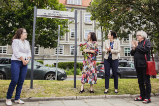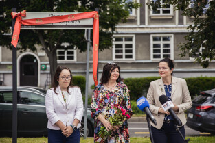 Gdańsk, ul. Podwale Staromiejskie. Odsłonięcie tablicy na skwerze im. Macieja Kosycarza. Nz. (od lewej) Kamila Błaszczyk, Hanna Kosycarz, żona Macieja Kosycarza i Prezydent Gdańska Aleksandra Dulkiewicz