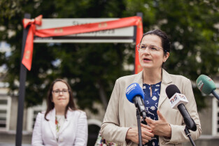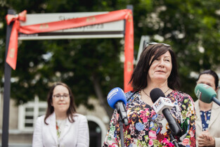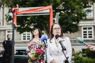Gdańsk, ul. Podwale Staromiejskie. Odsłonięcie tablicy na skwerze im. Macieja Kosycarza. Nz. Prezydent Gdańska Aleksandra Dulkiewicz